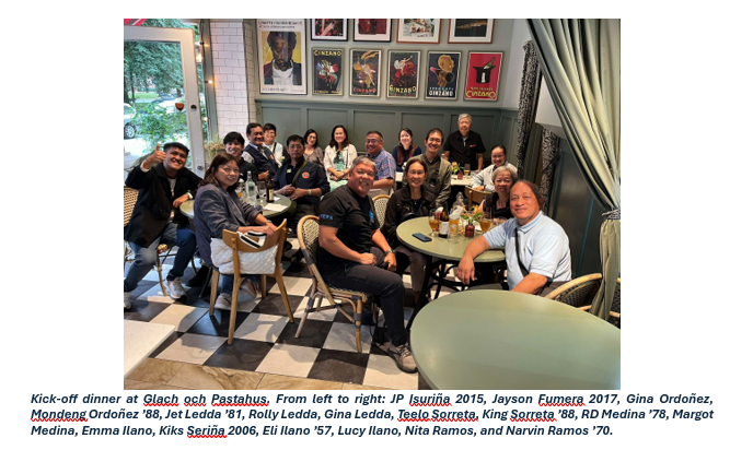 I arrived in the late afternoon of August 2nd at Arlanda Airport with the cool Stockholm breeze welcoming my first steps in this Nordic country. I immediately took the train to the Stockholm Central Station and headed directly to our chosen lodging, the Scandic Continental Hotel. The hotel was our accommodation for this highly anticipated fellowship and is known for its modern design but is surrounded by the traditional allure of old Scandinavia. Upon arrival at the hotel lobby, I was greeted by Narvin ’70 and his wife, Nita, as well as Mondeng ’88 and his wife, Gina, with warm smiles and handshakes. Next followed Jayson 2017, who also came from Manila and just finished his graduate studies in the Netherlands this June. We were then joined by retired U.S. navy officer RD ’78 and wife, Margot, Ambassador Jet ’81 with his wife, Gina, and their son, Rolly. Next came “EU President For Life” Eli ’57 with his daughters, Emma and Lucy. Suddenly the energy in the lobby skyrocketed as we filled the room with heartfelt greetings. I immediately felt at home with the brods, their presence washed away the fatigue of my 24-hour journey from Manila. Eli ’57, Narvin ’70, and Amb. Jet ‘81 also gave us delicious treats as welcoming “pasalubong”. To start the evening, Stockholm fellow and head organizer Kiks 2006 warmly welcomed the participants at the hotel lobby and guided the group through the city center for the welcome supper.