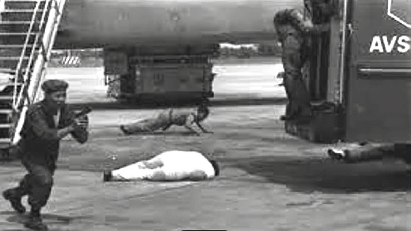 Ninoy's lifeless body lies on the tarmac at the Manila International Airport after he was shot while being escorted out of the airplane by security forces on August 21, 1983.