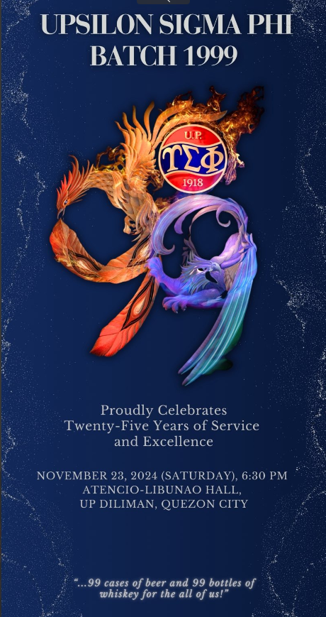 Twenty-five years ago, a remarkable group of young men walked the hallowed halls of UP Diliman and Los Baños, shaping and being shaped by the values of Upsilon Sigma Phi. Now, after two and a half decades, Batch 1999 proudly invites all fellows to join them in a celebration of "Service and Excellence" on November 23, 2024, at 6:30 PM, Atencio-Libunao Hall, UP Diliman. This milestone marks not just an anniversary but a legacy of camaraderie, achievements, and unwavering dedication to the principles of Upsilon.