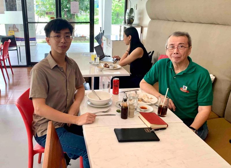 Yari Miralao ’88 and Liam Calvin Lu 2018 share a meal and a conversation.