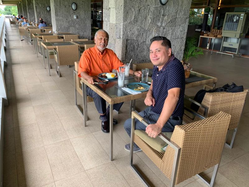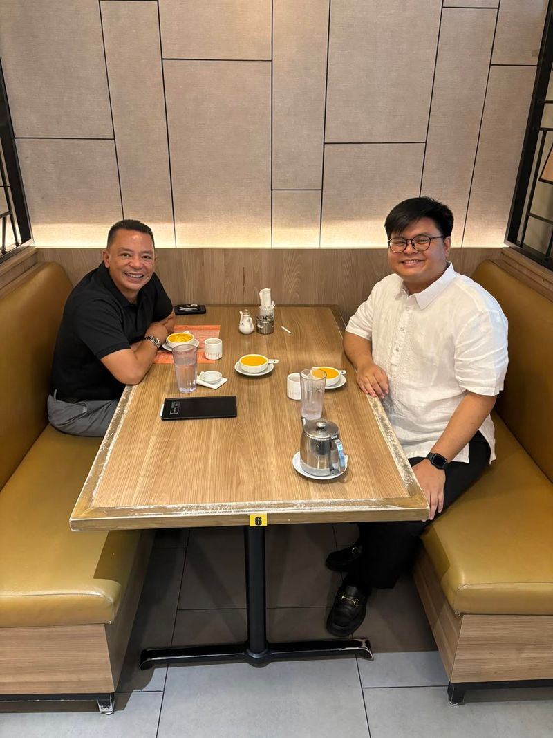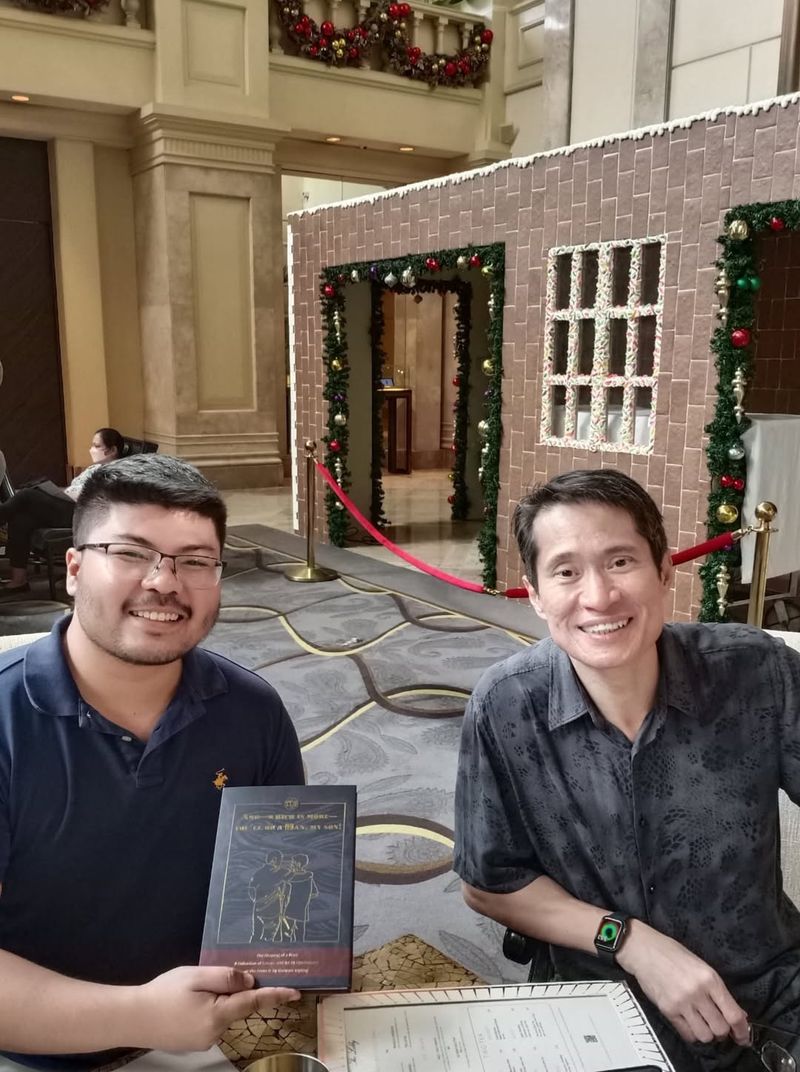 📸 Ken Sarmiento ’82 and Franz Legazpi 2018 share coffee, the IF book clutched proudly.
