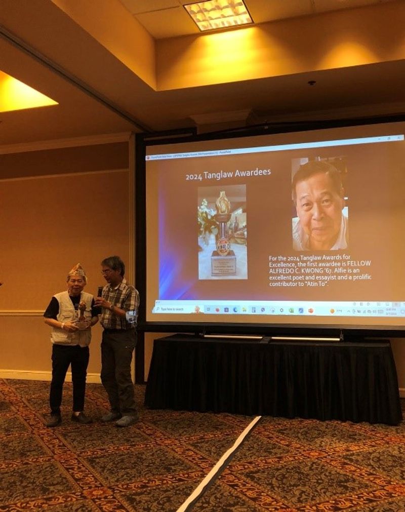 I didn’t know that we were to do that. Brod Bim Dolorico ’62, an awardee, had his prepared in a sheet of type-written notes. Another awardee, Angie Fandialan ’60, gave me an advance warning as Bim was making his spiel. Thank God I had a good full night of sleep. Of course, it was an extemporaneous delivery, my mind racing to find some relevant anecdote or observation about my art. I can only give you a gist, as you can imagine. I referred to the latest Taylor Swift album, called Tortured Poet Department, and commented the redundancy of her title. I said, “All poets are tortured, that’s just the way it is. For a long time, I see my poems as an elderly relative one stashes away in the attic, afraid for him to come down and embarrass me totally.” But finally in my crucible, I finally let that elderly relative down and my collection of poetry was birthed.