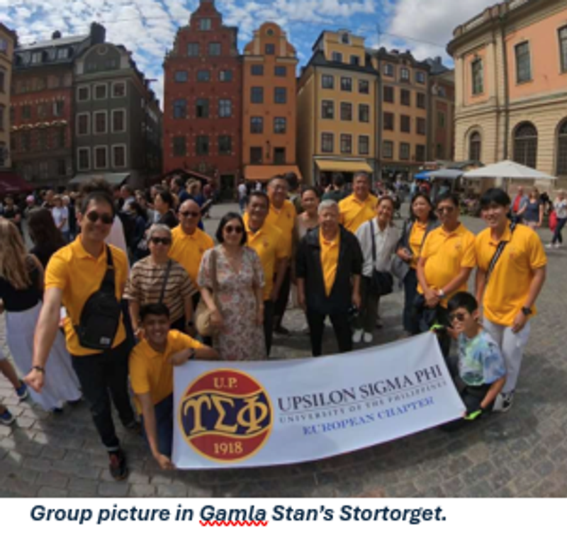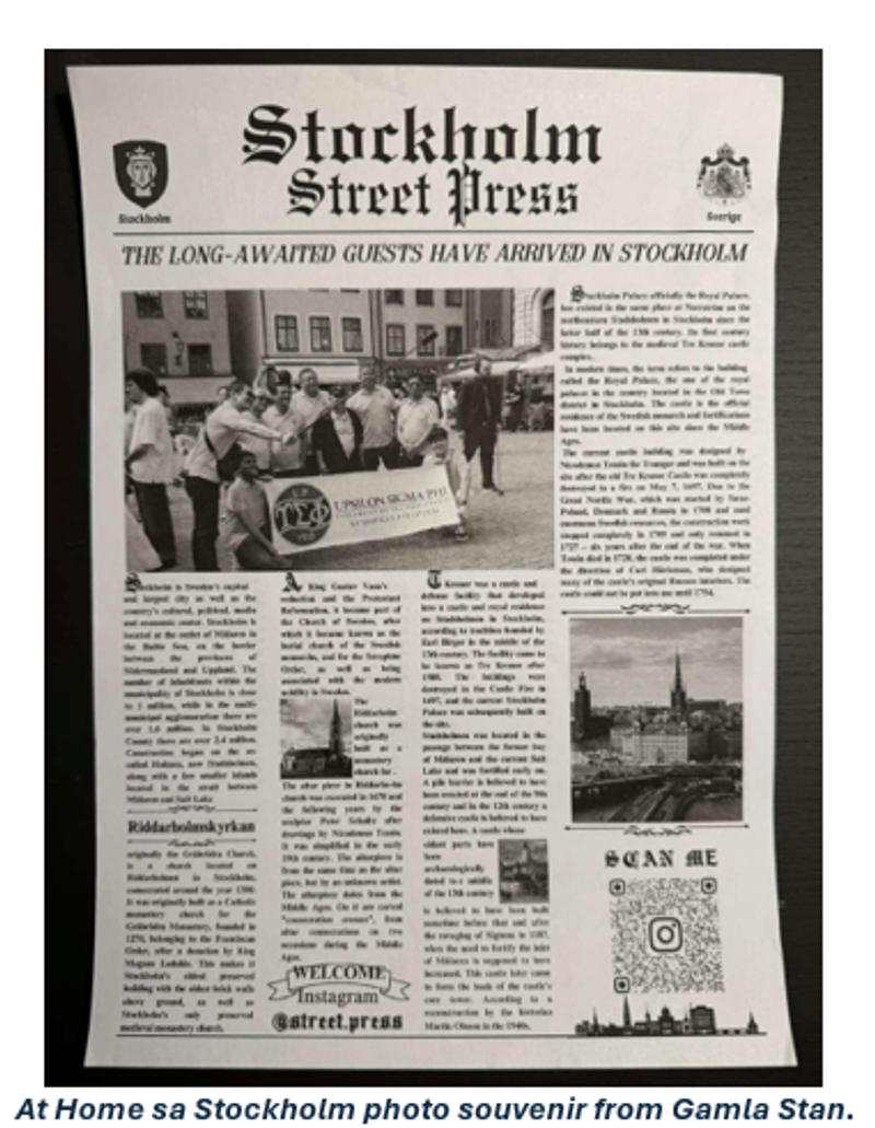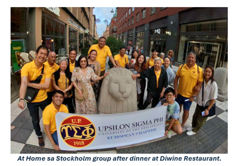 The evening was capped by the much-awaited fellowship dinner at the Diwine Restaurant, this restaurant showcases traditional European cuisine. After a whole day of exploring, the fellows and their families were able to relax, sit down and talk about their experiences in Stockholm. The evening will never be complete without the brods sharing their stories about our beloved fraternity and about life itself. As one of the youngest in the group, I was all ears, listening intently to their narratives of their resident days, their careers, and their journeys throughout Europe. Long-time Sweden-based Upsilonian Ed Gumabon ’58, despite being unable to attend the event, was there in spirit and gave the group several bottles of fine wine to enjoy with our dinner. Thank you very much for the treat, Brod Ed. The restaurant's cozy atmosphere permitted us to continue to exchange stories, sometimes eliciting boisterous laughter, allowing us to bolster connections on a fraternal level. As the night came to a close, we returned to our hotel, carrying with us the lasting memories of another fun-filled day in Stockholm.