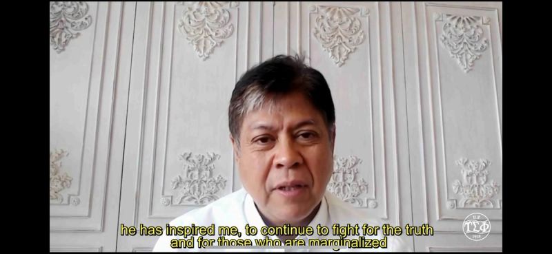 “...So his sacrifice led me to the path of activism. Led me to the path of searching for the truth and he continues to inspire me, especially today in the light of so much disinformation, so much lies directed at me as a national political leader. Hindi pa tapos ang laban para sa katotohanan and he serves as an inspiration because he stood up, he risked his life for us in the fight for democracy and the truth and as an Upsilonian and my Brod in the fraternity he has inspired me to fight for the truth and for those who are marginalized.” [Former Senator Kiko Pangilinan]
