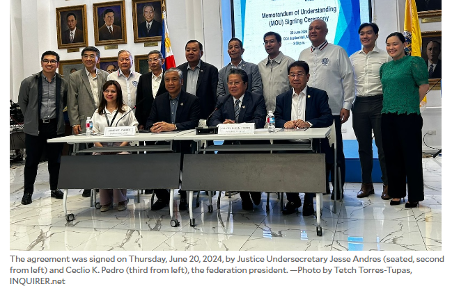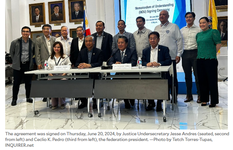 Justice Undersecretary Jesse Andres signed the agreement with the federation president, Cecilio K. Pedro.