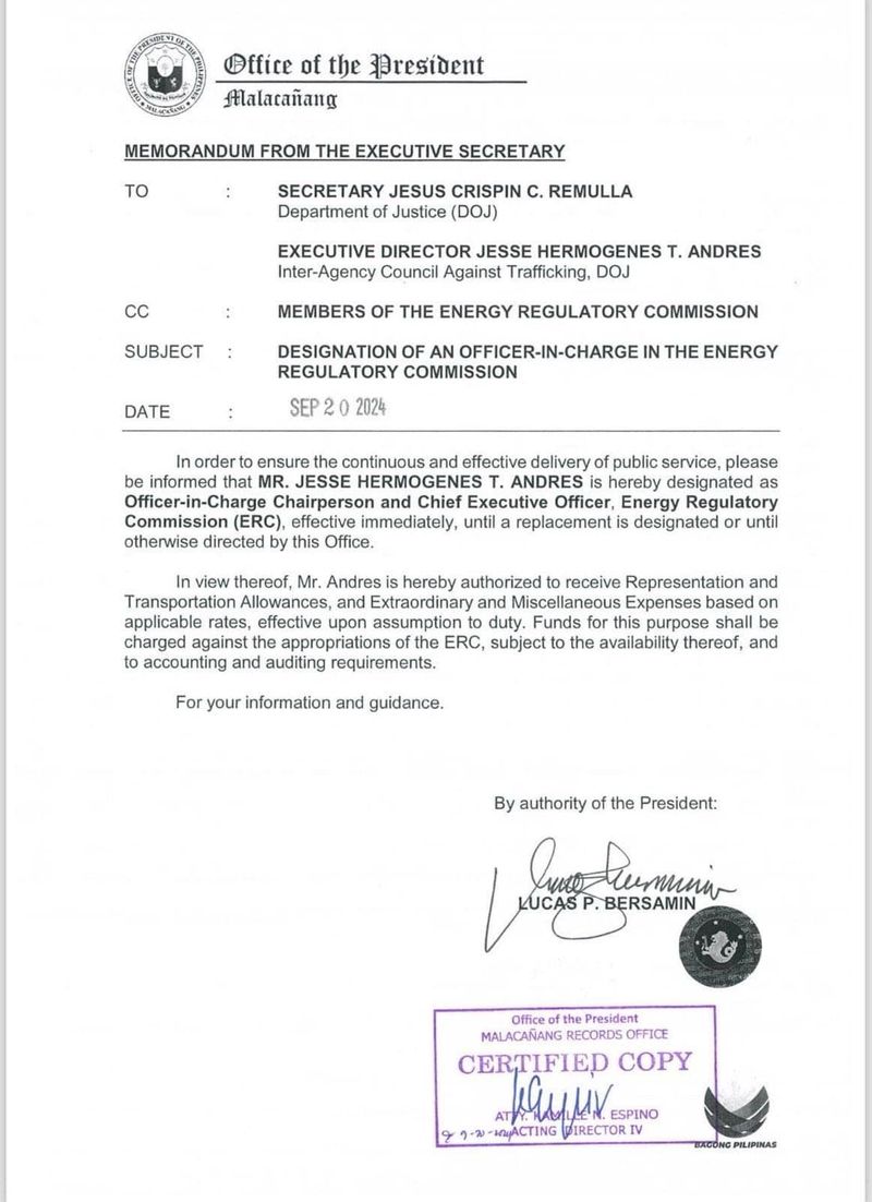Signed by Executive Secretary Lucas Bersamin, the memorandum cited the need to “ensure the effective delivery of public services” in appointing Andres as officer in charge of the ERC.