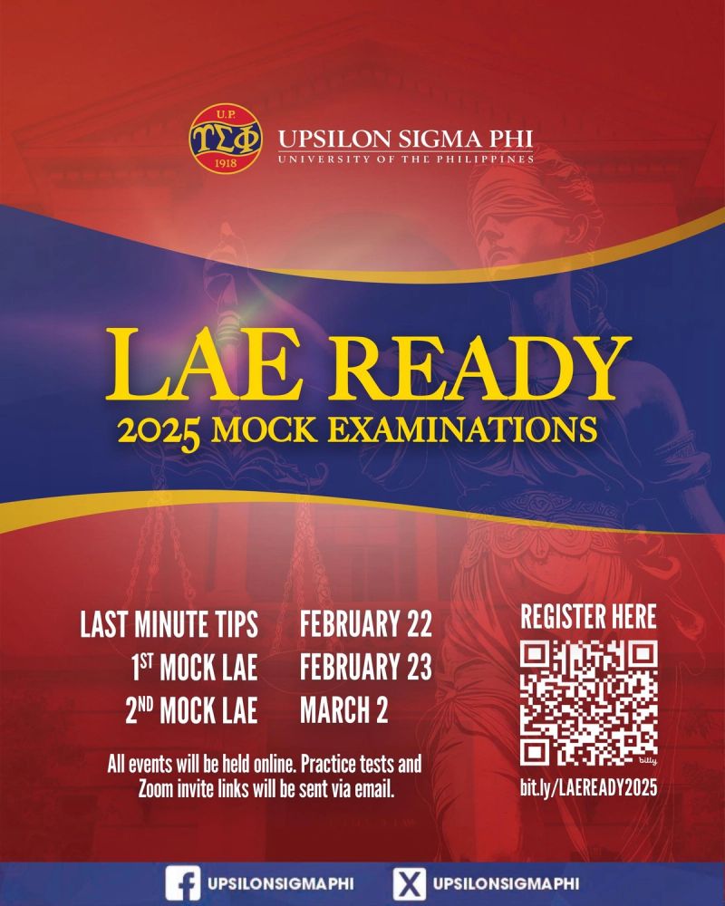 LAE Ready is an initiative that aims to guide aspirants in their review and preparation for the upcoming University of the Philippines College of Law - LAE. This includes two mock exams and a talk that aims to brief the upcoming takers with what to expect for the LAE.