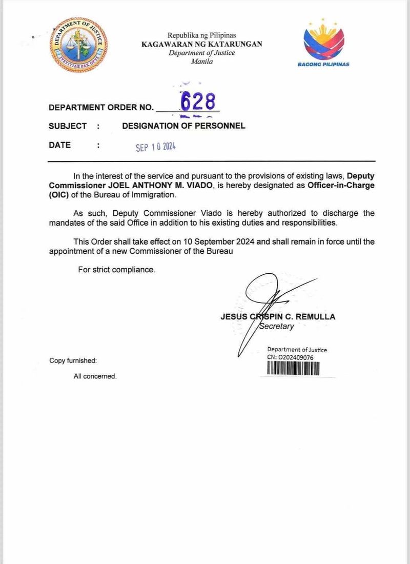 MANILA, Philippines — Justice Secretary Jesus Crispin Remulla has designated Deputy Commissioner Atty. Joel Anthony Viado as Bureau of Immigration (BI) officer-in-charge following the dismissal of Commissioner Norman Tansingco.
