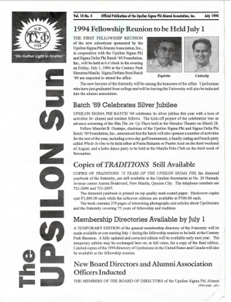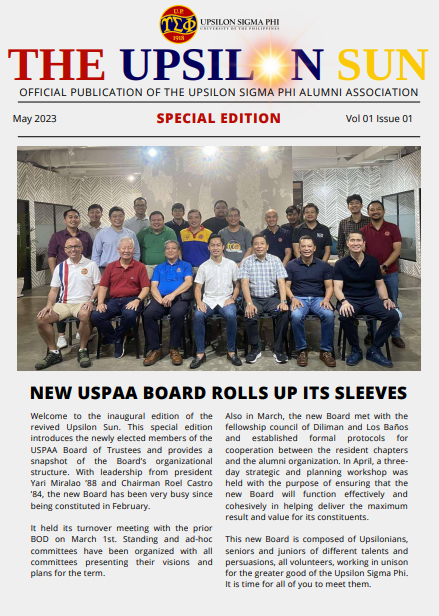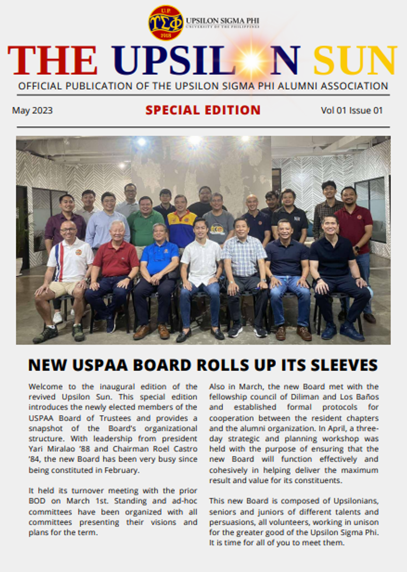 The Upsilon Sun was first published by the alumni association in 1985 as a newsletter and bulletin with the late Carlo Magno at the helm and supported by his trusted crew of brods from his outfit, the NPCI. There was Nes Jacinto (+), Jes Sundiam and Celso Ani (+), all publishing veterans, who helped get it off the ground. As a quarterly publication, it succeeded in delivering news and information to the fellowship and was distributed mainly during alumni meetings and fraternity gatherings. As far as I could remember, there was no mailing list to distribute it, so only brods who were fortunate enough to get a copy, would know what was going on in the fraternity. With a quarterly newsletter, there was enough time to curate and write the news about the fraternity and its members prior to publication. News traveled slowly and became stale by the time it reached its audience. But that was the old way, prior to the internet age, before mobile phones, before e-mail. With the advent of new technology, news now travels with lightning speed, and you have to be on top of your game to take on the responsibility of delivering news in a timely manner.