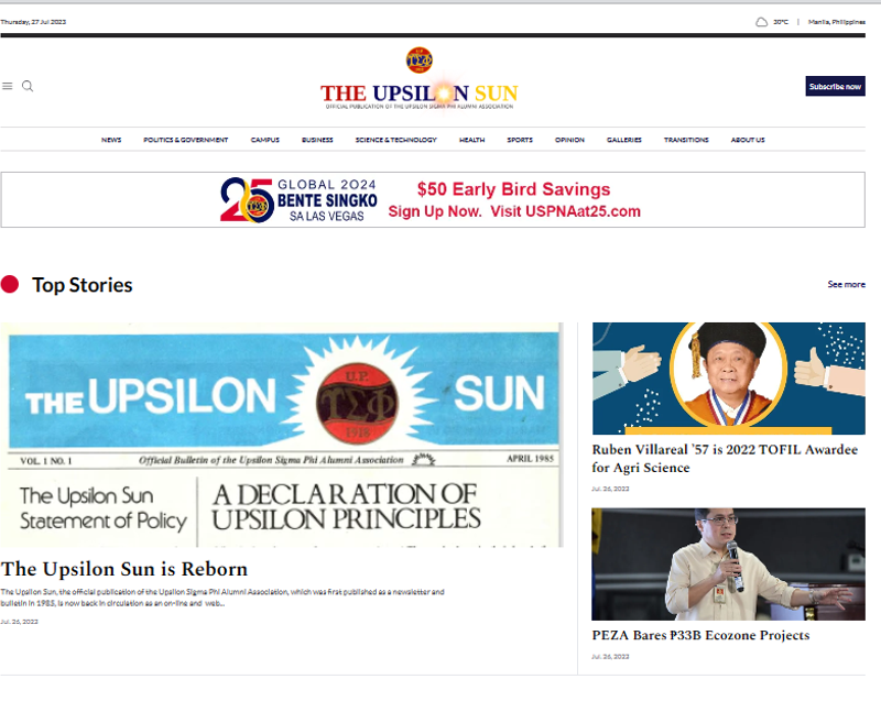 The first order of the day was to look for the right person to help me find the applications and tools to manage content and establish the Sun’s on-line presence and identity. Cai Monteser recommended his batchmate Rennard Marquez to assist with the effort as a paid resource. Rennard, an IT consultant who specializes in software development was the perfect choice, and in May of 2023, we began work on creating the initial design of the on-line publication using Contentful, a content management system (CMS). We identified the many sections that were needed to present the news in a professional manner using several models. To cut to the chase, the Upsilon Sun went on-line on July 26, 2023, merely sixty days after we published our special edition. Also in July, we filed a trademark application with the Intellectual Property Office (IPO) with the help of Ken Sarmiento, the head of the USPAA’s legal committee.