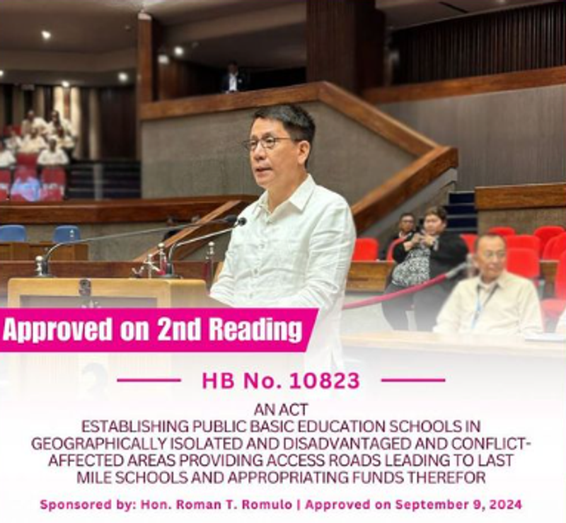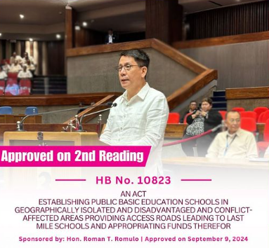 On September 9, 2024, the House of Representatives passed on second reading, House Bill No. 10823, known as the Last Mile Schools Act. The bill was sponsored by Rep. Roman Romulo of the lone district of Pasig and aims to establish public basic education schools in geographically isolated, disadvantaged and conflict-affected areas (GIDCA). The bill also provides for funding to build access roads to these areas.