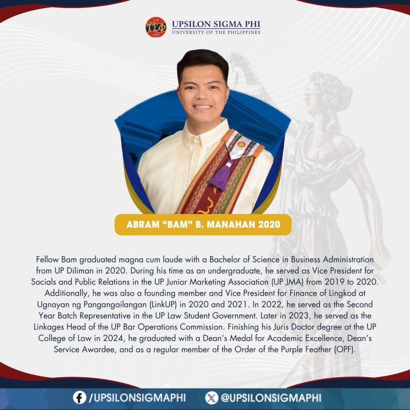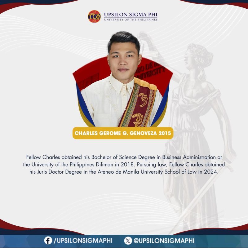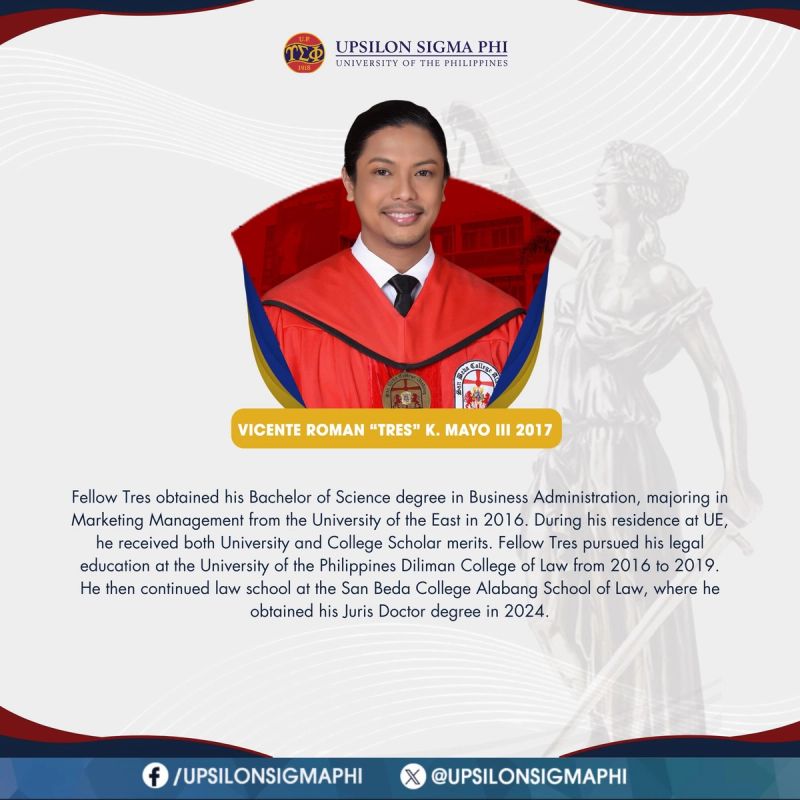 The Upsilon Sigma Phi proudly congratulates the 6 newest members of the legal profession, who have successfully passed the 2024 Philippine Bar Examinations held last September 8, 11, and 15, 2024. These distinguished fellows are: