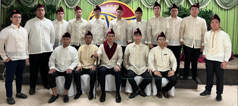 The 2023 Upsilon Sigma Phi Fellowship Council of U.P. Diliman wearing traditional barong and fez with the Illustrious Fellow holding the cane.