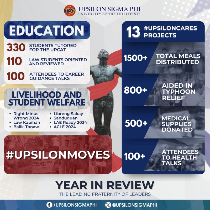 - Upsilon Cares - Relief efforts for Typhoon Carina victims: Provided over 300 hot meals to dormitory residents, jeepney drivers, security guards, and UP staff at various locations in UP Diliman.