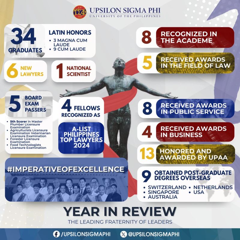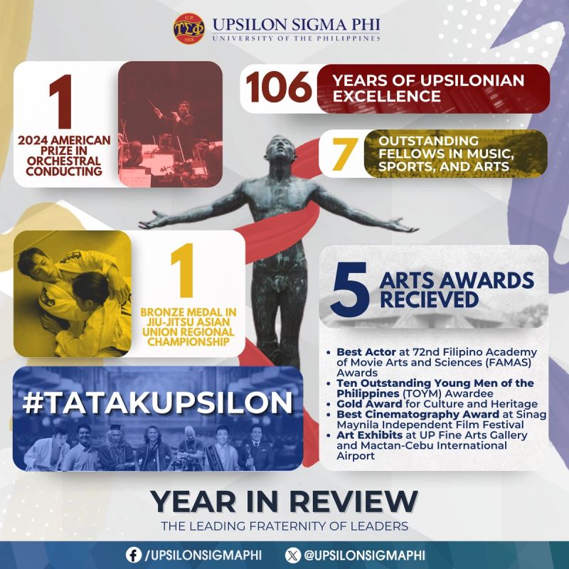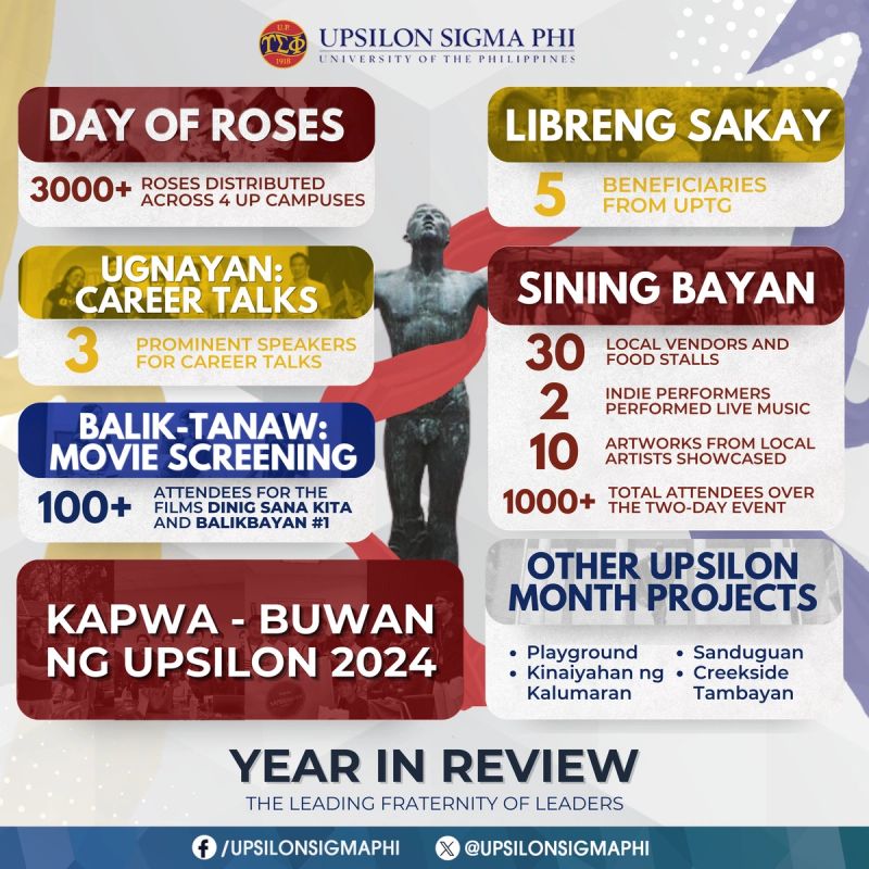 With the combined efforts of the fellows, the ongoing support of our sponsors, and the assistance provided by our partners, the Upsilon Sigma Phi was able to meet its commitments throughout the year. Through the projects formulated to benefit the fellows, the student body, the entire UP community, and the nation, we have been able to address a wide array of social issues that continue to affect our people.