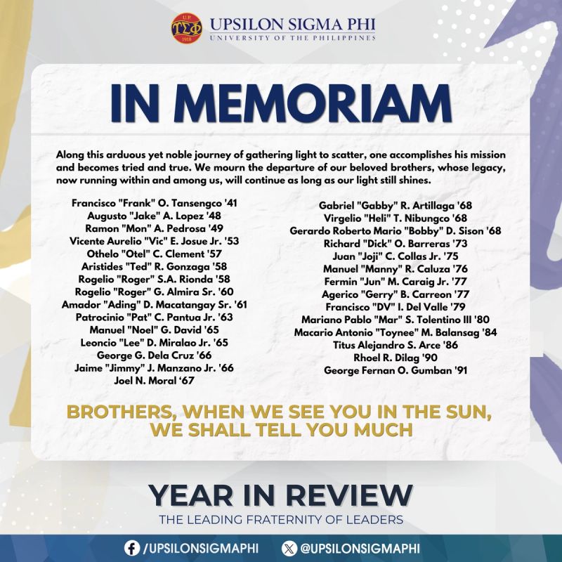 Along this arduous yet noble journey of gathering light to scatter, one accomplishes his mission and becomes tried and true. We mourn the departure of our beloved brothers, whose legacy, now running within and among us, will continue as long as our light still shines.