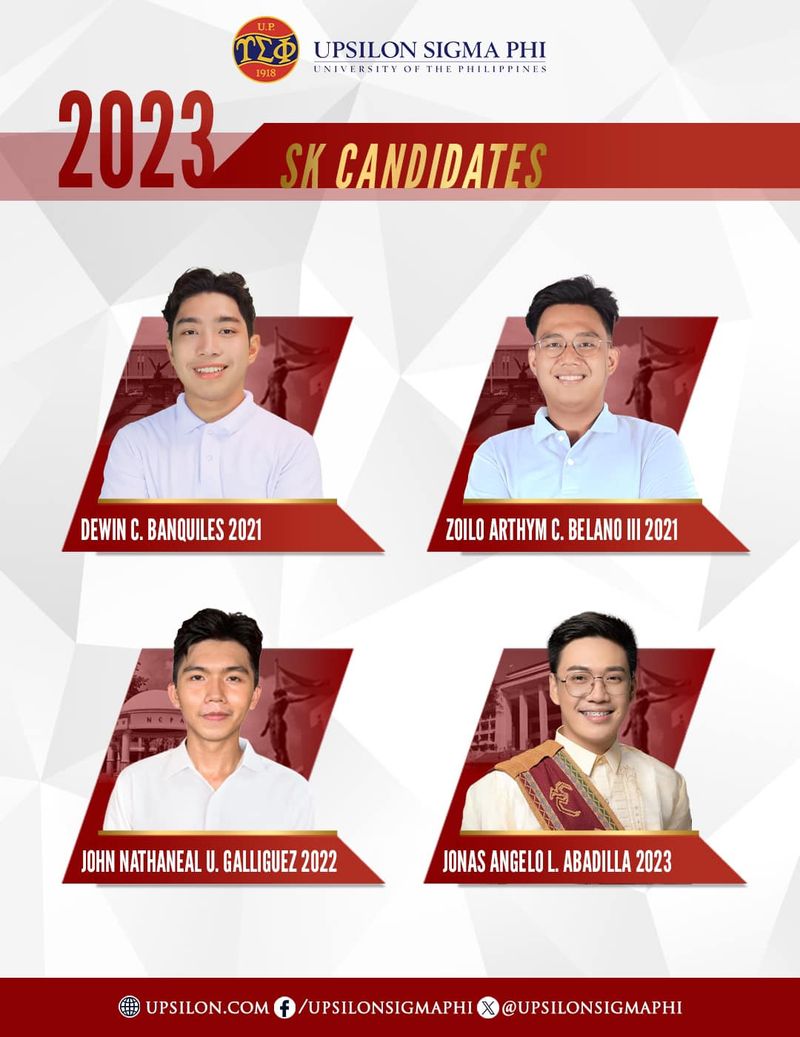 Four Upsilonians are running as chairpersons in the upcoming Sangguniang Kabataan (SK) elections. The SK elections will be held on October 30, 2023 as part of the nationwide barangay elections.