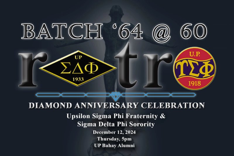 The Upsilon Sigma Phi and Sigma Delta Phi Batch 1964 will be celebrating their 60th anniversary on December 12, 2024, at the Ang Bahay ng Alumni in U.P. Diliman.