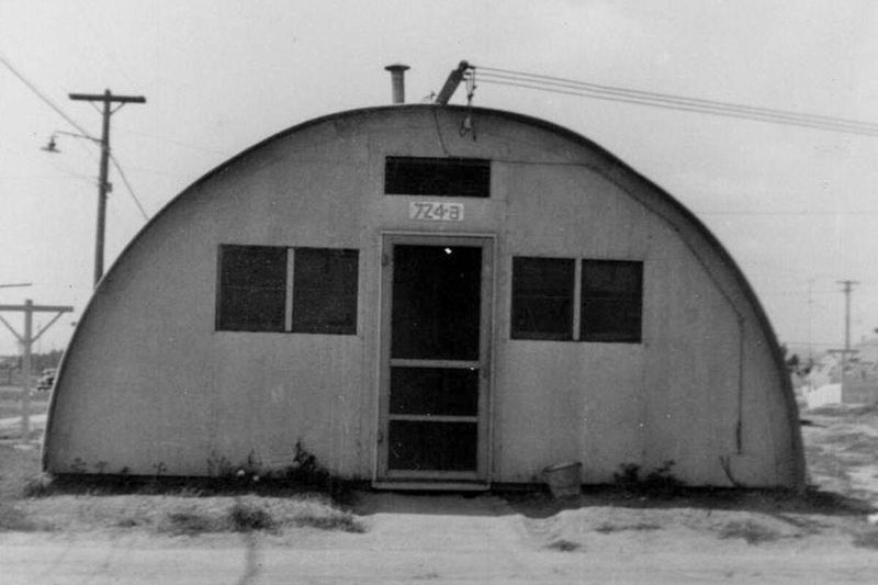 (14 A Quonset hut is a prefabricated building made of corrugated galvanized iron sheets with a semi-circular shape that combines the roof and walls into one continuous structure. It was very hot and uncomfortable inside a Quonset hut during the daylight hours.)